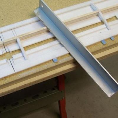 With one wing panel weighted down, support the other panel 1-11/16 inches off the board and install the dihedral brace. Wingtip washout will improve stall characteristics.