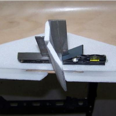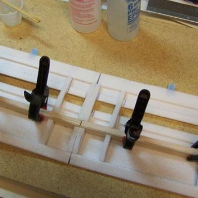 Using epoxy, glue one of the balsa sticks to the 3/4-inch wide surface of each foam strip so the 1/8-inch edge is even with the squared foam edge. It is important to use a straightedge to keep the balsa stick straight. When this has cured, epoxy another 1/8 x 1/4 balsa stick to the other side of the foam strip. Allow this to thoroughly dry then trim the extra foam to create the balsa/foam/balsa sandwich. Use the dihedral gauge found on the plans to sand one end of each spar to match the dihedral angle.
