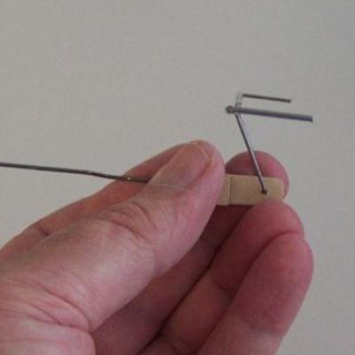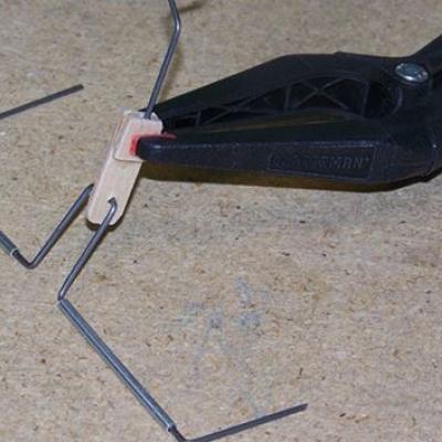 To allow adjustment, make a V bend as shown on the plans. Insert the Z bend in one of the holes in the 1/16 plywood attachment piece. Align and epoxy the 1/8 plywood support and clamp until dry.