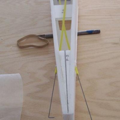 Make two pieces of 1/16 plywood 1 x 11/2. Epoxy these to the wing’s TE where the rubber bands will go over the edge to the wing dowels.