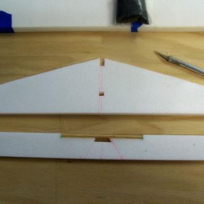 Cut two strips of 6mm foam, 1-1/8 x 10 inches long for the ailerons. Cut two more strips 1-1/8 x 9-3/8 long. Mark the hinge locations on the edge of each control surface and slot with a hobby knife. If you are going to taper the control surfaces, it is easier to do so before cutting out the control surface. Lay it out on the 6mm foam, mark the TE with two lines about 1-1/2mm from the top and bottom surface and sand to shape to the lines (see plans). When satisfied, cut the control surface from the main piece.
